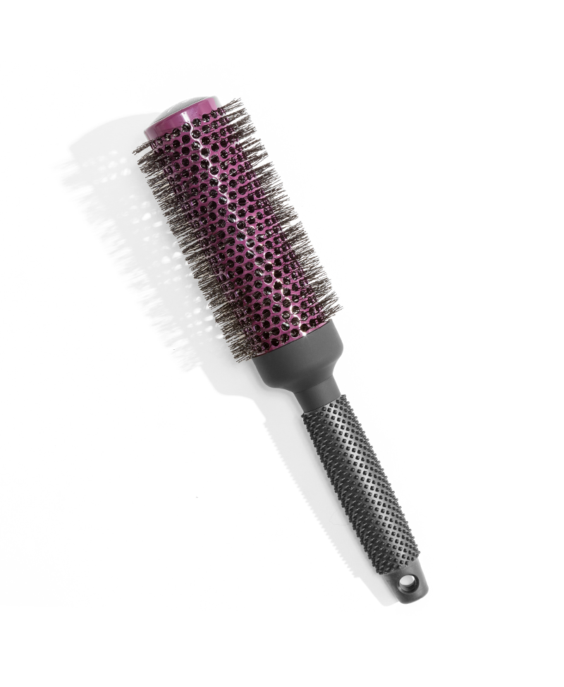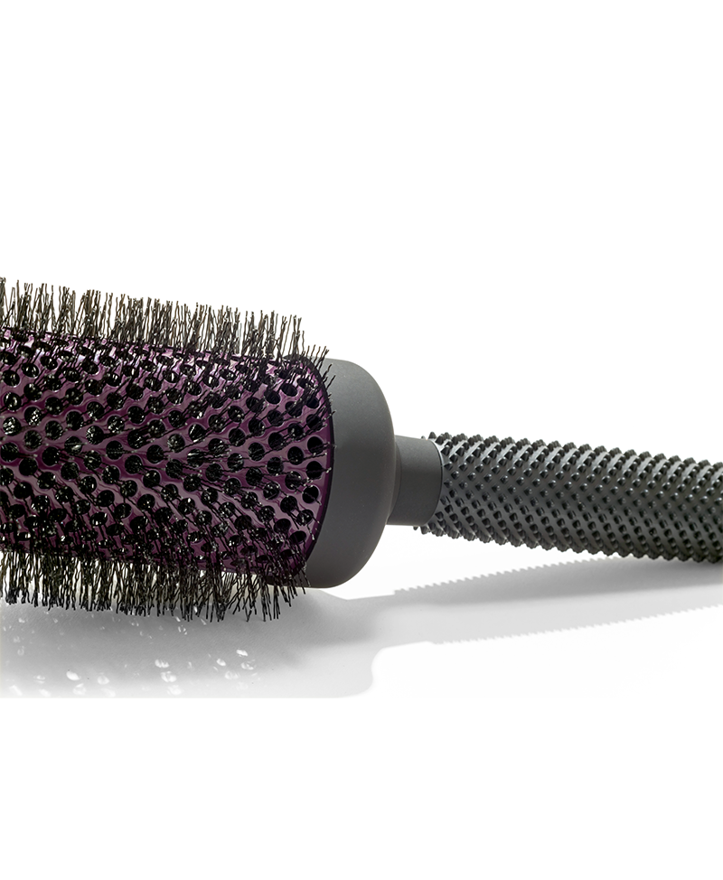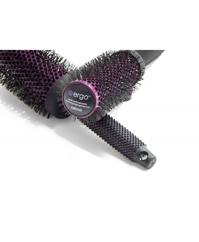 Cepillo redondo Ergo 43mm con Turmalina y Carbono. Ideal para dar volumen, crear ondas y eliminar el frizz en cabello de longitud media. Agarre ergonómico.