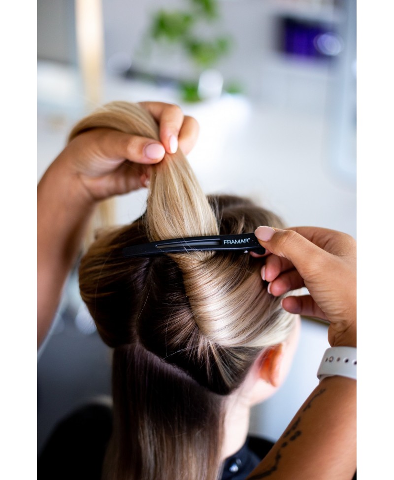 Clips seccionadores Framar de agarre extremo en color negro. Ideales para separar cabello grueso o gran volumen. Antideslizantes, ligeros y resistentes para coloración y corte.