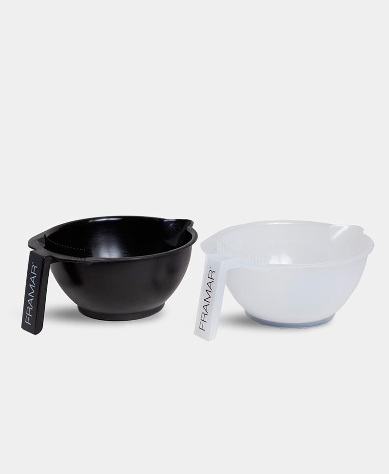 Simplifica tu estación de coloración con el Set Profesional de Pocillos Framar. Este pack esencial incluye dos bowls (uno negro y uno transparente) diseñados para estilistas que requieren separar diferentes fórmulas de tintura, developers o decolorantes con total claridad.