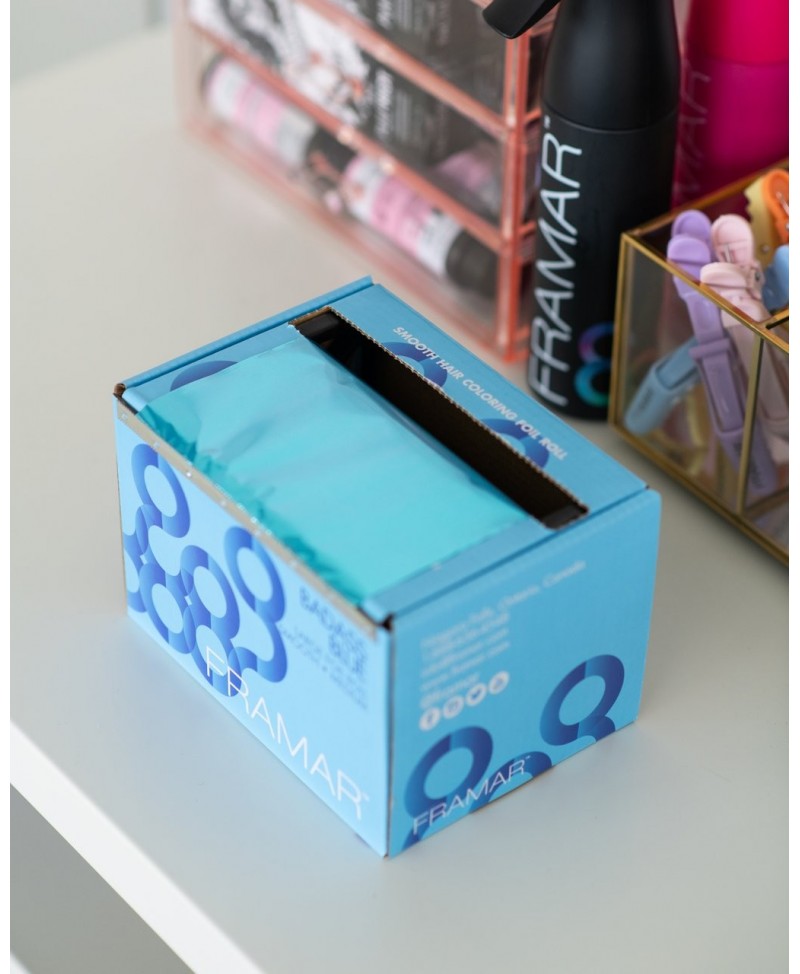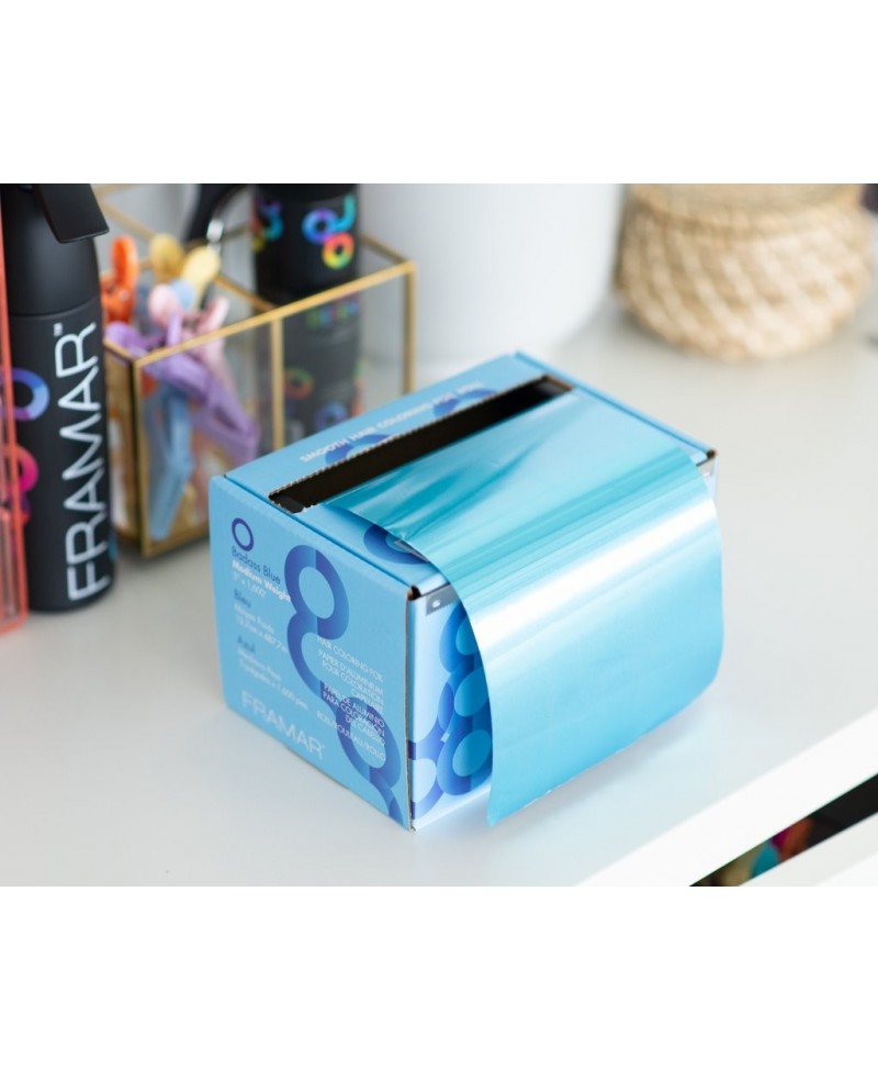 Papel de aluminio Framar Badass Blue (500m). Rollo profesional de color azul, formato medium. Máxima economía y resistencia para mechas y coloraciones de alto volumen.