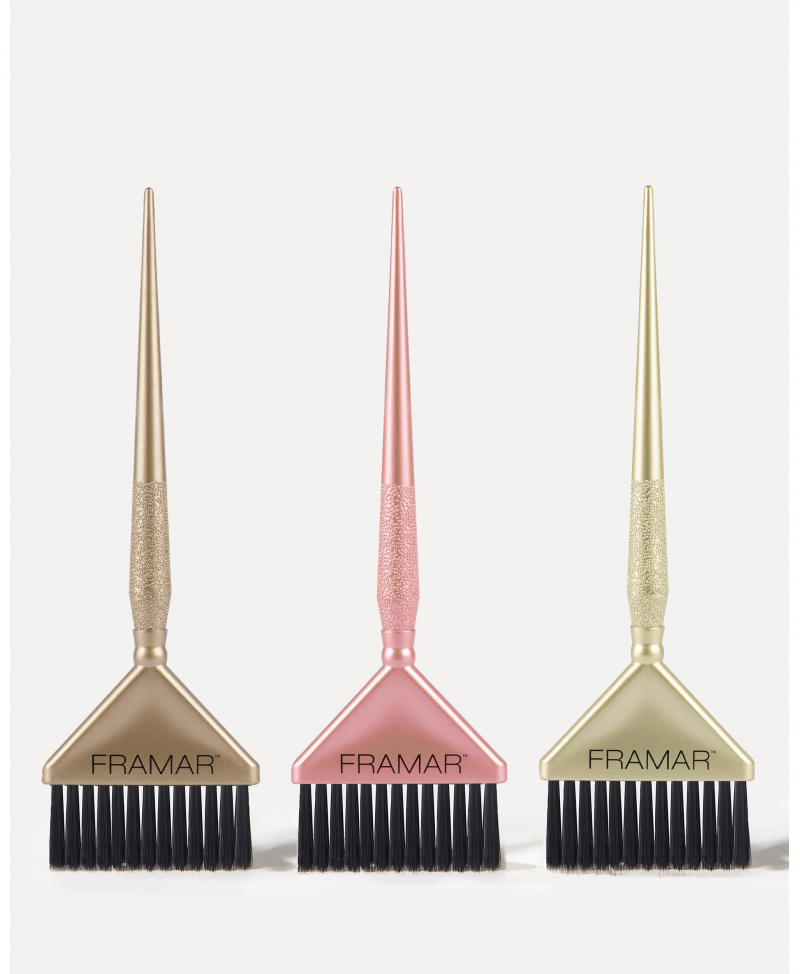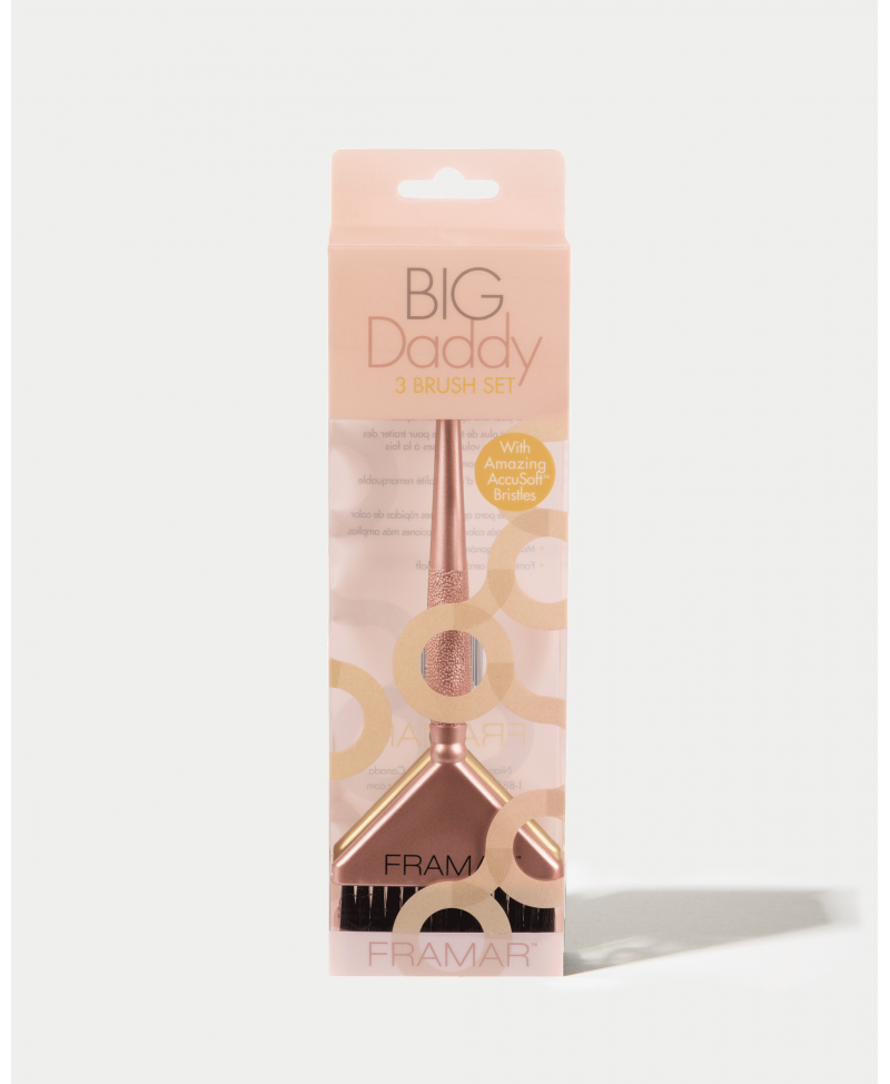 Set de 3 Brochas Framar Big Daddy Metallic. Brocha extra ancha para cobertura rápida y uniforme. Diseño metálico elegante. Ideal para altos volúmenes de color.