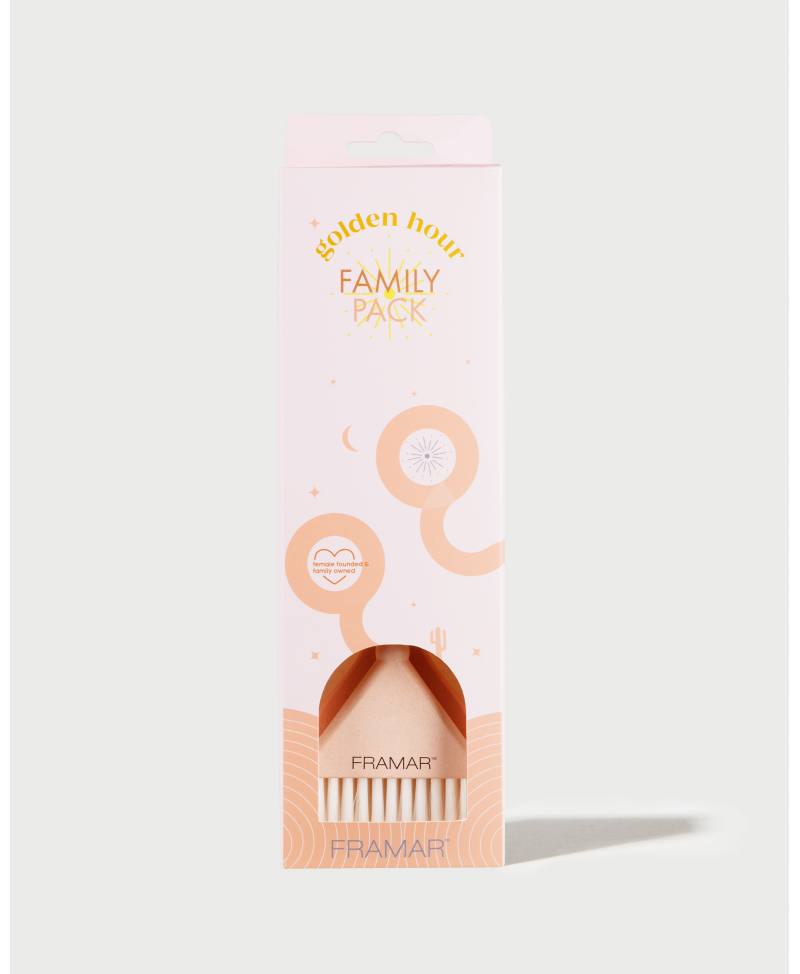 El Family Pack Golden Hour de Framar ofrece un kit de 3 brochas de tamaños variados, asegurando que tengas la herramienta perfecta para cada técnica. Disfruta de la máxima precisión y velocidad con cerdas AccuSoft™ y un diseño lujoso de edición limitada en tonos dorados.