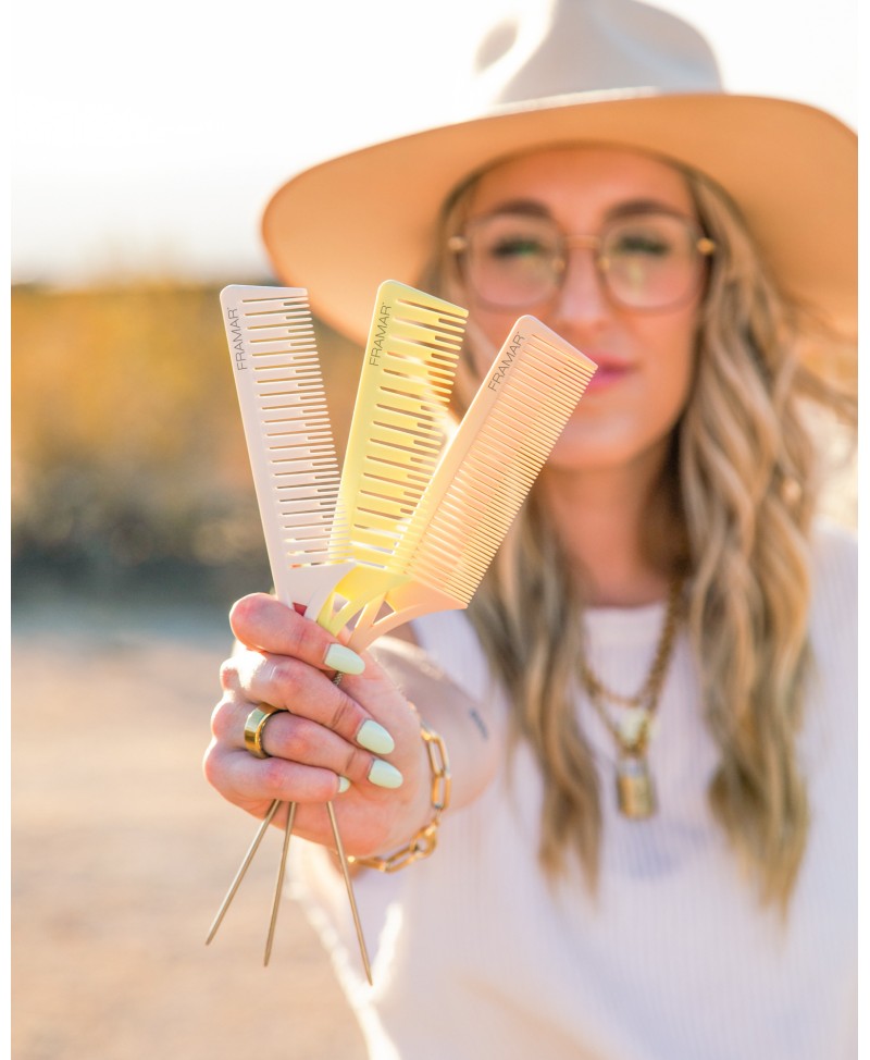 El Peine Balayage Dreamweaver de Framar, de la colección Golden Hour, es el secreto para mechas tejidas ultra-rápidas y uniformes. Su diseño especial de dientes asegura una separación precisa y consistente del cabello en segundos, siendo una herramienta indispensable para el balayage.