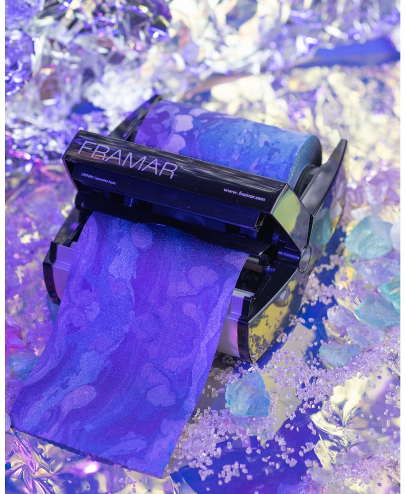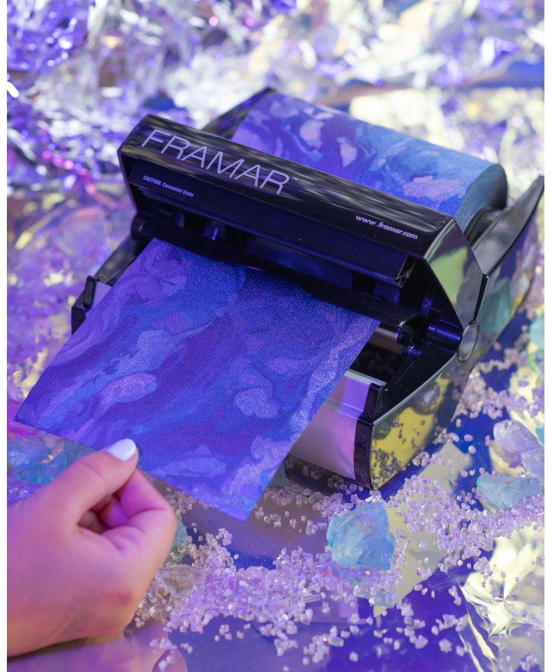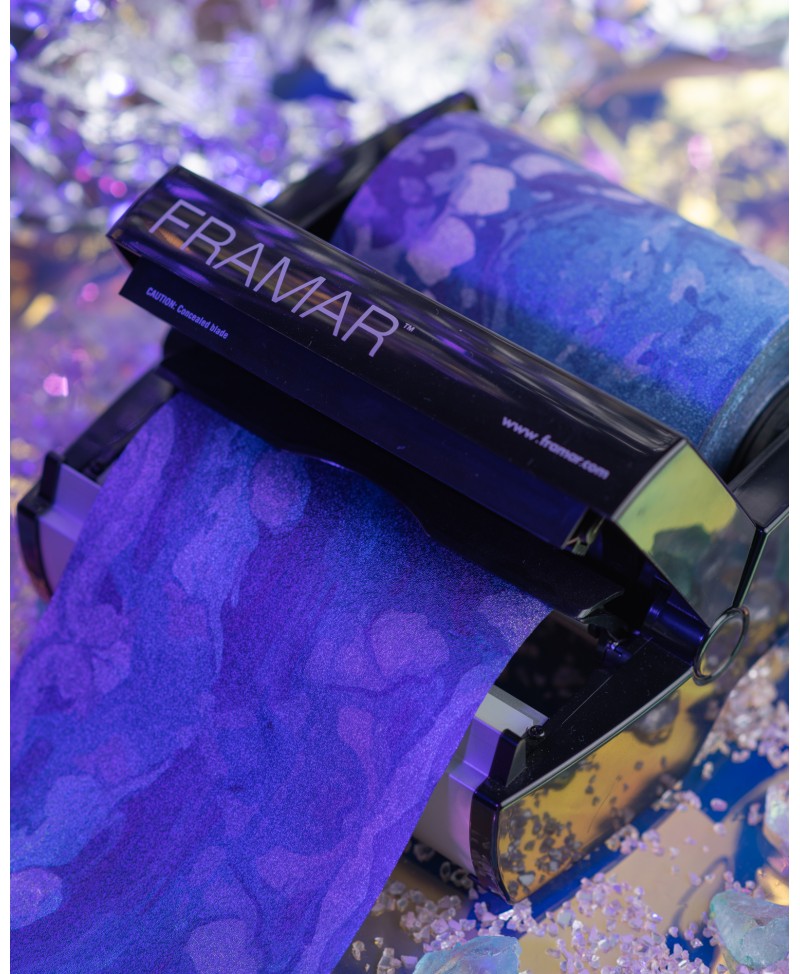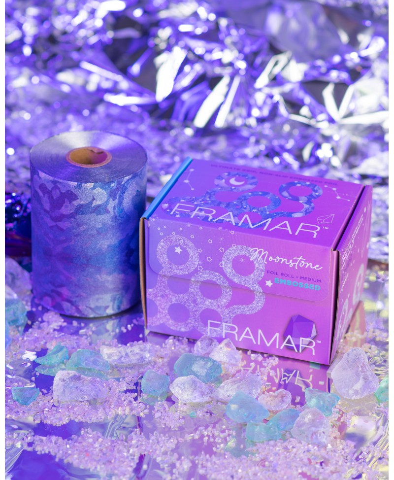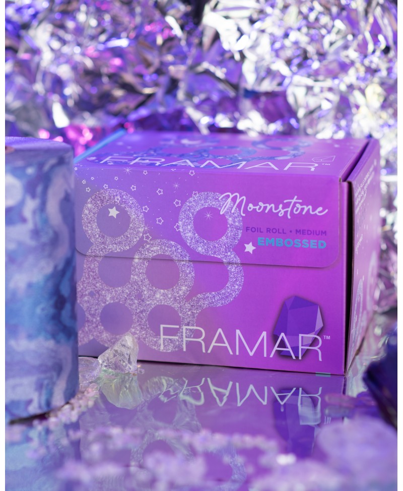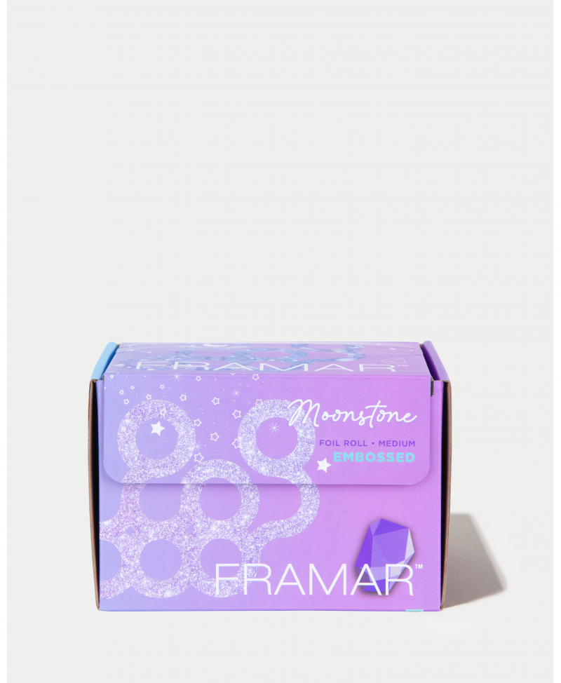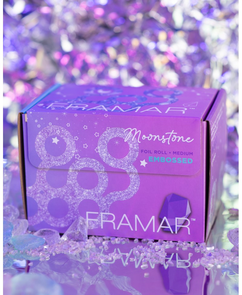 El rollo de aluminio Moonstone Embossed de Framar (100m) combina un diseño iridiscente de edición limitada con una superficie texturizada. Esta combinación asegura un agarre superior y la flexibilidad para cortar la longitud perfecta para cada servicio de coloración.