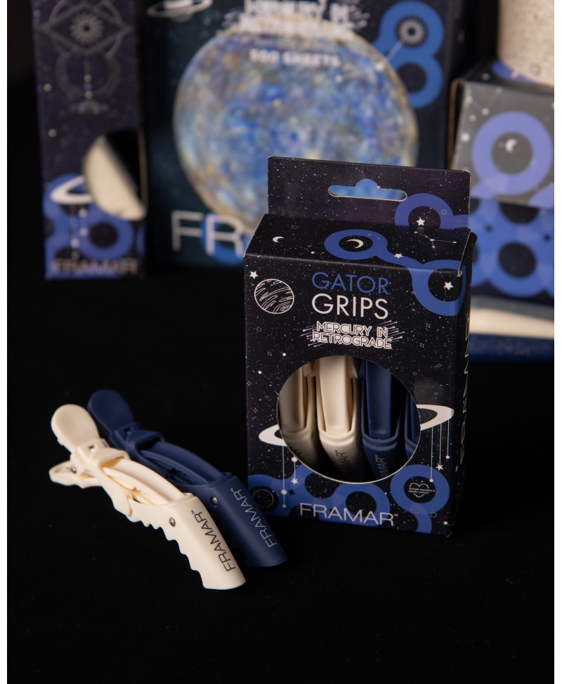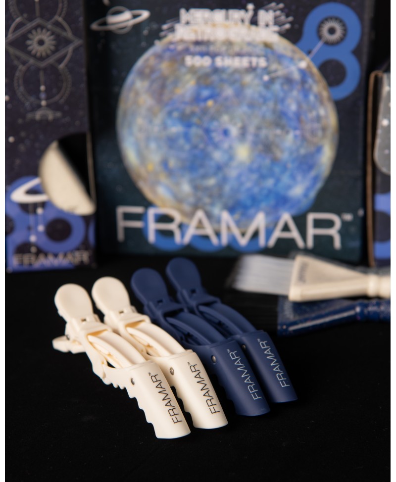 El set de Clips Cocodrilo Mercury in Retrograde de Framar ofrece una sujeción profesional y firme. Estas pinzas de agarre fuerte, con un diseño audaz de edición limitada, son esenciales para seccionar cabello grueso y saturado de producto sin deslizamiento, optimizando el tiempo de servicio.