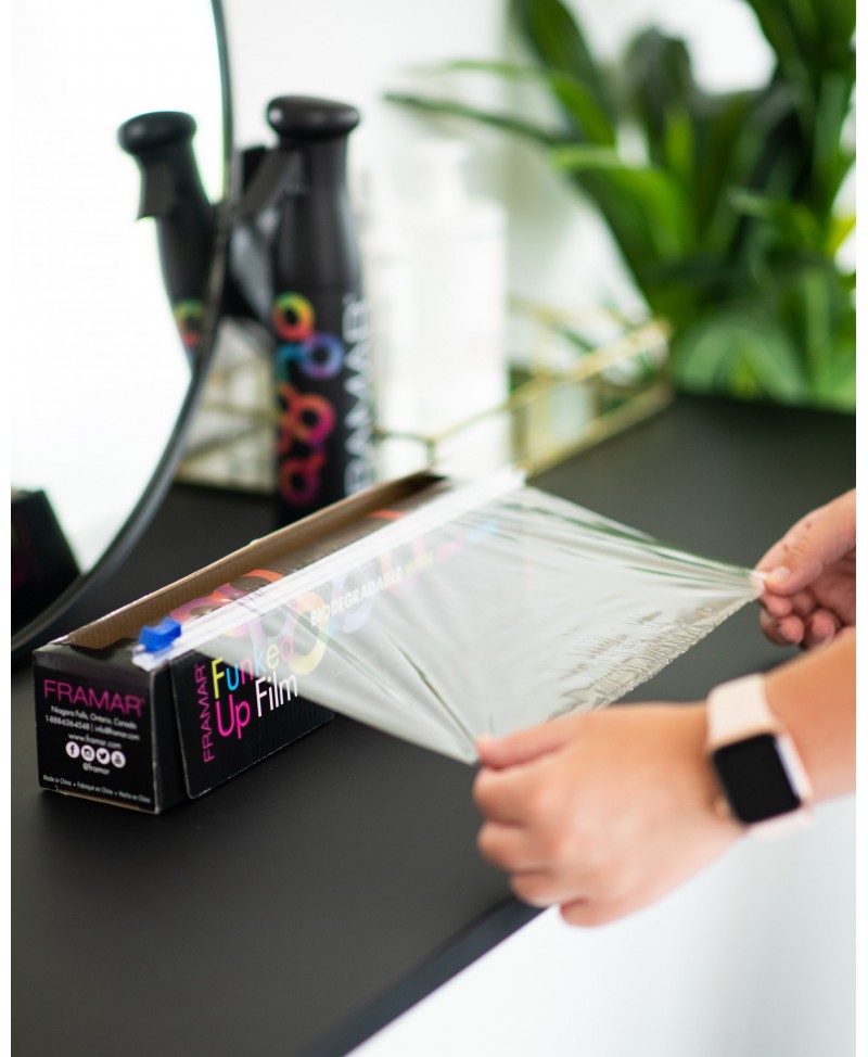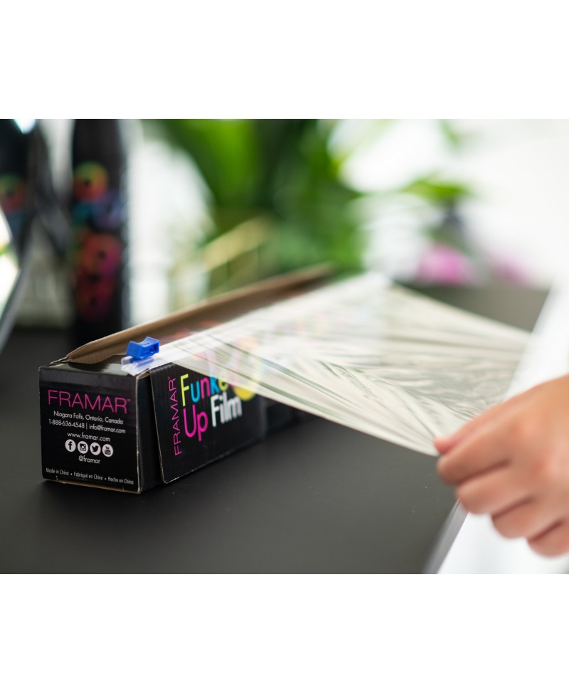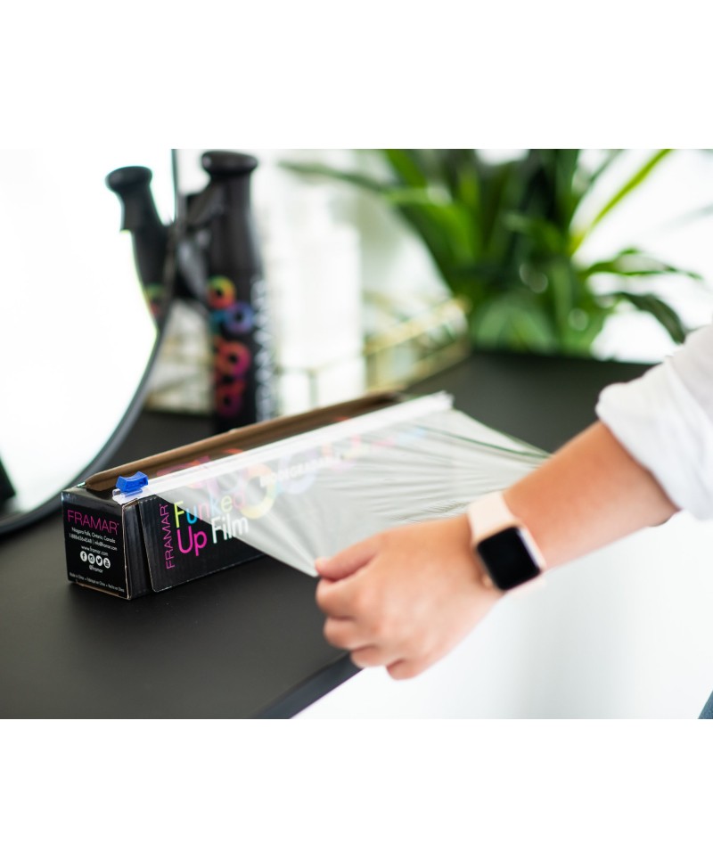 Film protector Framar Funked Up (92m). Evita la transferencia de color en balayage y mechas a mano alzada. Transparente para fácil monitoreo del proceso.