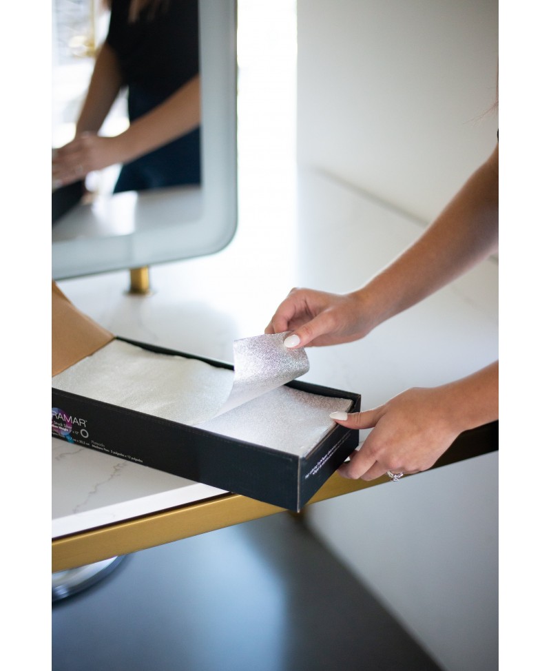 Optimiza tu flujo de trabajo sin sacrificar la calidad de tus mechas. Las Hojas de Aluminio Framar Star Struck Embossed vienen pre-cortadas (13cm x 30.5cm) y listas para usar, eliminando el tiempo de corte en el salón.