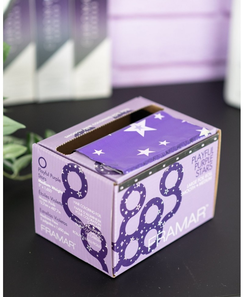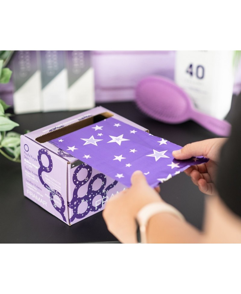 Abastece tu salón con el mejor valor y el rendimiento técnico superior. El Rollo de Papel de Aluminio Framar Playful Purple Stars ofrece una impresionante longitud de 500 metros en formato Medium, ideal para profesionales y salones de alto volumen.