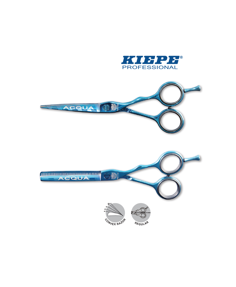 Set de tijeras Kiepe ACQUA Series (2 piezas). Filo navaja para corte de precisión y tijera esculpidora. Diseño premium y ergonómico para estilistas profesionales.